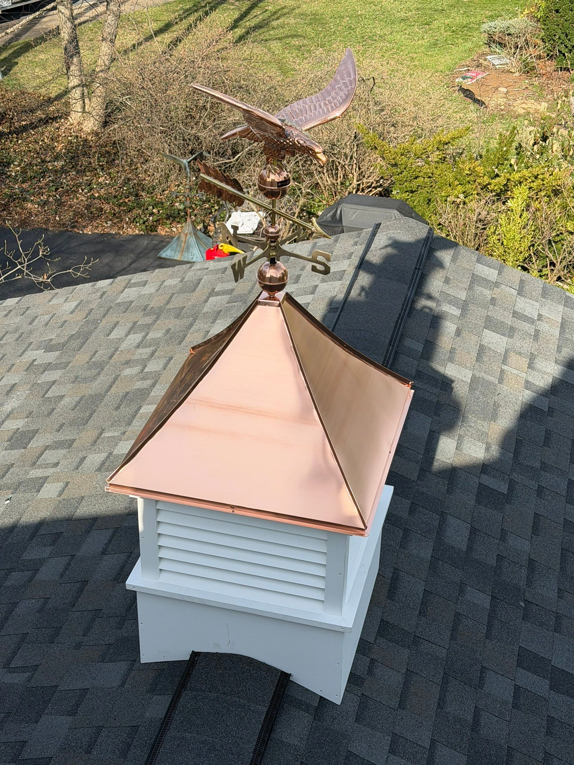 To address the rotting structure, the old cupola was removed and replaced with a new 7.5-foot tall PVC and copper cupola.